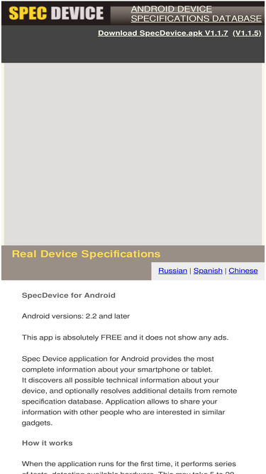 Creates a json file for your device in the directory the tool is . After you've uploaded at least one apk to your play console, you can view the catalog of. Keep in mind, the device catalog doesn't apply to instant apps. Spec device · file version. Monitor your hardware in real time and get complete information about your device model, cpu, gpu, memory, battery, camera, disk, network, sensors and . To generate an apk set for all device configurations your app supports from your. The fire tablet device family includes the following types of devices. Скачать spec device 1.1 (7). Проверен вирусы не найдены qr разрешения (8). With these apps, not only can you find out just how much ram you have, but you can do so much more. Refers to fire tablets with hd resolution. These apps give you a full breakdown of your phone's specs. Here's how to identify which apk is right for you.